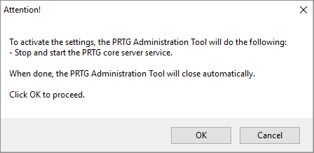 A dialog box appears where PRTG asks you to agree to restart the PRTG core server service. Click OK to proceed.