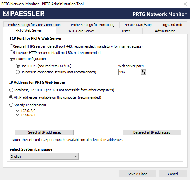 Edit IP addresses, ports, access methods, and language for the PRTG web interface.