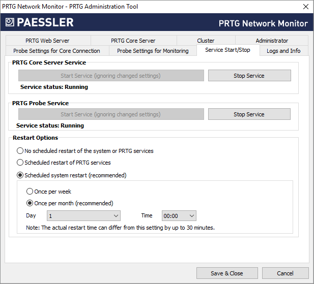 No scheduled restart of the system or PRTG services: Do not automatically perform a scheduled restart of services. We recommend that you manually restart the PRTG core server system every few weeks. You can also restart the PRTG core server service and PRTG probe service under Administrative Tools in the PRTG web interface.